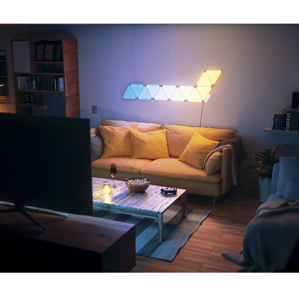 Объединяйте цвет, свет и свой творческий потенциал, чтобы создать идеальную атмосферу в доме используя смарт-модуль Nanoleaf Aurora! Эта невероятная конструкция включает в себя девять RGBW LED панелей, выполненных в форме треугольников. Специальные крепления позволяют соединять отдельные ячейки создавая причудливые фигуры на ваш вкус. Конструкция может крепиться на стену, потолок или мебель. Затем просто подключите ее к своему смартфону через специальное приложение и создавайте собственные световые композиции.
